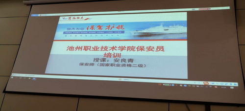 4月23日上午九点恒杰保安服务有限公司在我院一号会议室组织召开全体保安驻校前岗位培训会议。保卫处副处长徐必友、池州市公安局贵池分局驻校警务室程国平所长出席会议并讲话。
