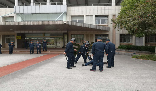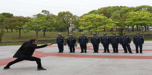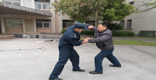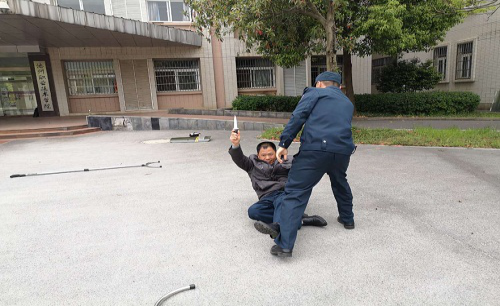 恒杰公司总经理、保安师安良青对全体保安进行岗前业务培训,并模拟演练不法分子持械冲撞校园进行紧急处置。